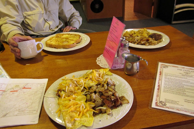 Meanwhile, Eric and I rode into Rosalia in search of breakfast. There were two choices: A coffee shop and The Fairlane. The coffee shop looked nice, if you were after coffee and pastries, but we needed something a bit more solid, hearty. The Fairlane looked like maybe the kind of place that could deliver. It's a real different place though.