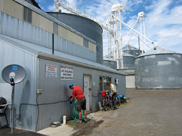 No water though, and we were getting pretty parched. Next stop was Pine City. Not even a post office there, just houses. We looked for someone, anyone, out in their yard whom we could ask if we could fill our bottles from their hose. Nobody around. But Pine City also has a grain elevator and the grain elevator has a spigot. We knocked on the door but nobody was home. We hoped it would be okay and then we just let it rip. Did I mention we were
