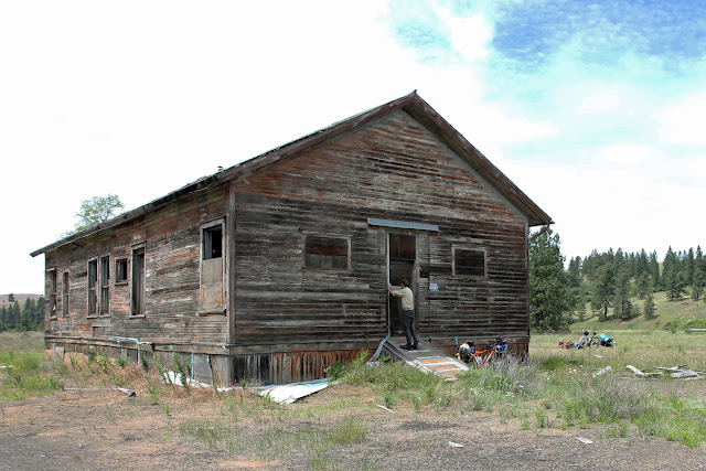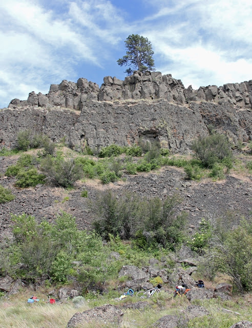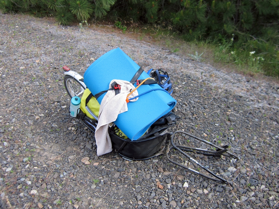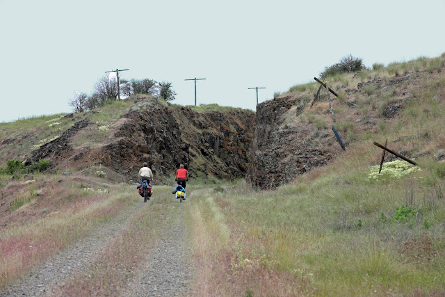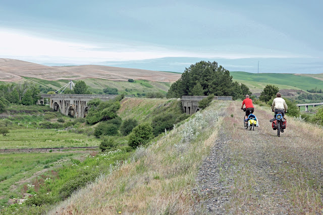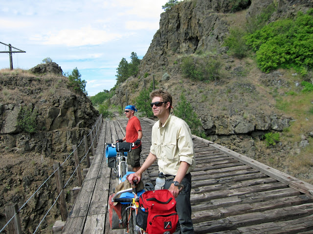 As we were just about to cross the rad trestles leading into Rosalia, Eric noticed that the filling had squished out of Scott's sleeping burrito. See the blue rolled-up pad and the sleeping bag inside it on Eric's bike? That's exactly the way Scott's was supposed to look, but all you can see is the pad.